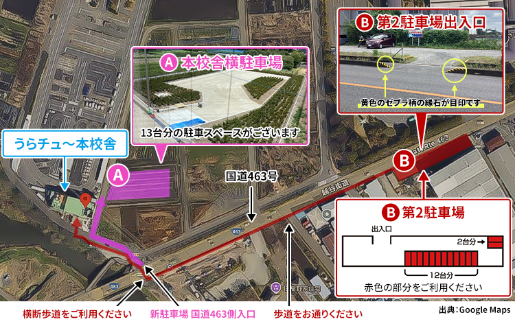 「本校舎横駐車場」は、13台分の駐車スペースがございます。こちらが満車等でご利用になれない際に「第2駐車場」(うらチュ~本校舎まで徒歩約3分)をご利用ください。