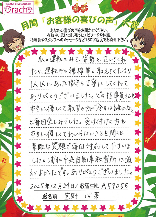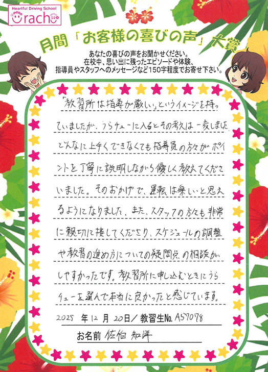 ★大賞「どの指導員も優しく、細部まで見てくれる丁寧な教習が毎回楽しみだった。受付も素敵な笑顔で対応してくれ、うらチュ~に通えてよかった」