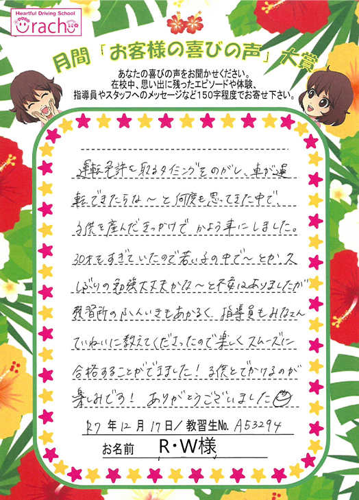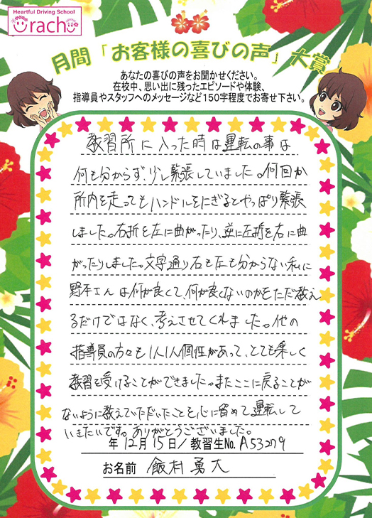 「最初は運転が不安でしたが、丁寧な指導で自信がつき、うらチュ~を選んで良かったと思いました。ここに来ると笑顔が増え心地よい場所でした」